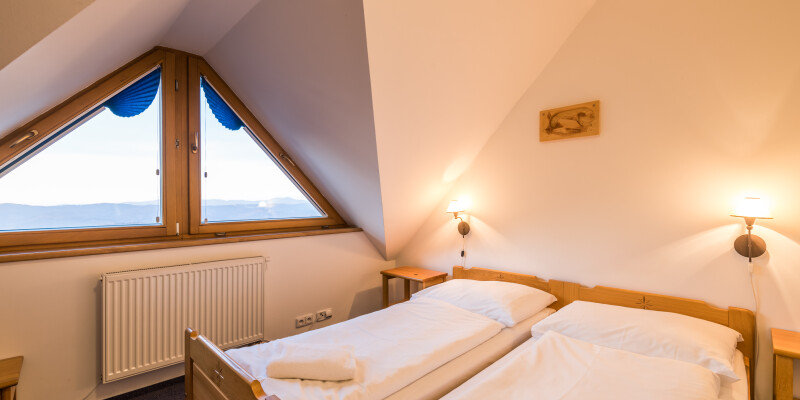 Pokoj v bezprostřední blizkosti hlavní budovy hotelu. Toto ubytování nabízí větší klid a soukromí, blízký kontakt s okolní přírodou. Pokoj se třemi samostatnými lůžky, kdy dvě lze využít jako manželskou postel. K dispozici je zde ještě čtvrté lůžko jako přistýlka. Vlastní sociální zařízení, televizor, wifi připojení, stojan na lyže a vysoušeč obuvi.