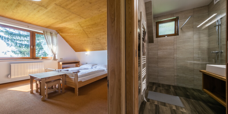 Pokoj najdete pár kroků od hlavní budovy hotelu. Jeho hlavní předností je více klidu a soukromí, krásný výhled do okolní přírody. Pokoj má při vstupu jednu oddělenou místnost se dvěmi lůžky, které se využívají jako manželská postel. Je vybaven televizorem, připojení wifi. Sociální zařízení se sprchou a WC a jedno samostatné WC, stojan na lyže a vysoušeč obuvi. V horním podkrovním patře jsou samostatná 4 lůžka, televizor a wifi připojení.